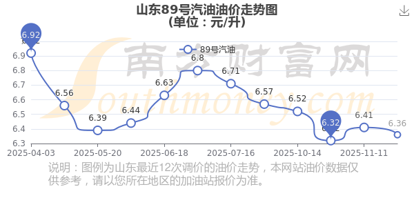 12月4日,山東89號汽油的價格是6.36元每升,本次的調整時間為11月25日,對比上次的調整降了0.05元,降0.78%,下次調整時間為12月8日24時,還有4.07天。