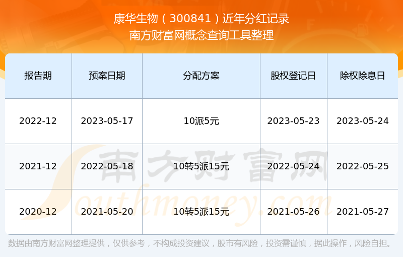 康華生物最新一次公布的分紅方案為10派5元。本次權(quán)益分派股權(quán)登記日為2023年5月23日,除權(quán)除息日為2023年5月24日,派息日為2023年5月24日。