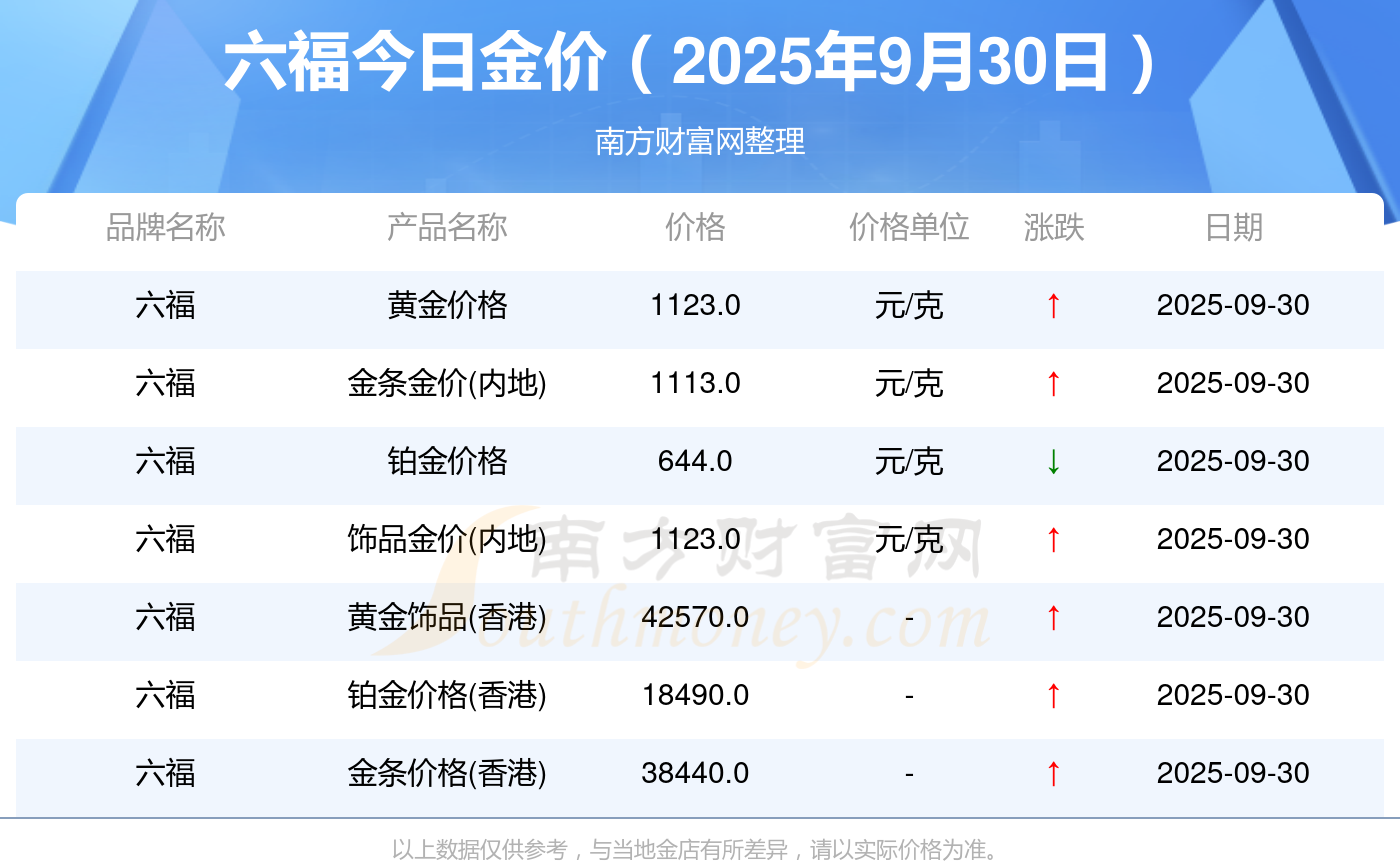 六福今天黃金價格多少一克_六福黃金價格一覽表(2025年9月30日)