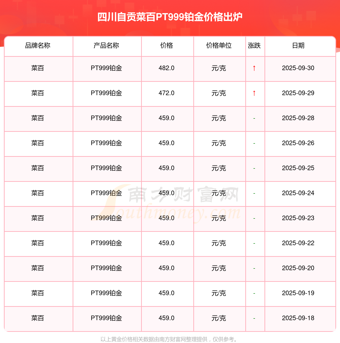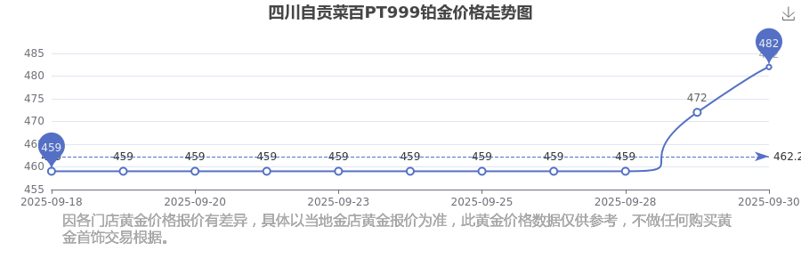 四川自貢菜百在 2025年9月30日,PT999鉑金的售賣價格是 482.0元/克。