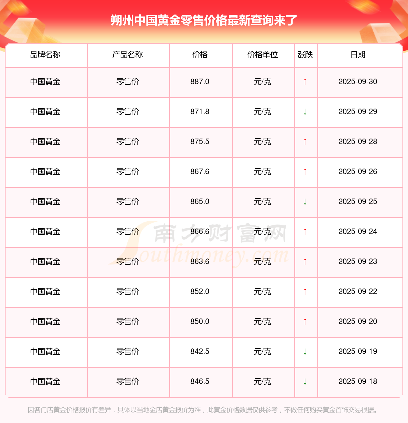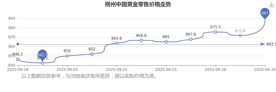 朔州中國(guó)黃金在 2025年9月30日的零售價(jià)零售價(jià)格為 887.0元/克。