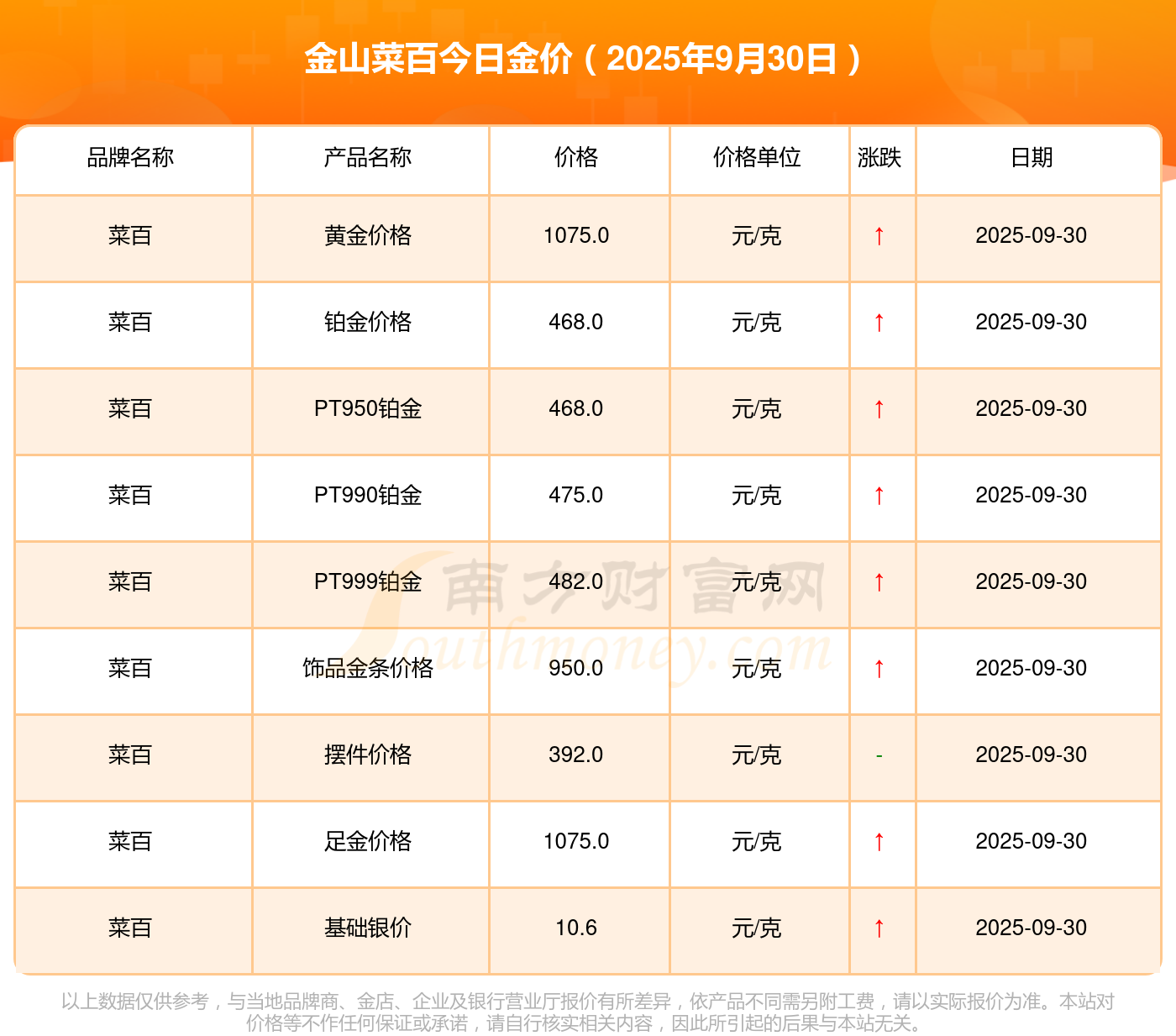 2025年9月30日 金山菜百金價最新行情 金山菜百黃金價格今天多少錢一克