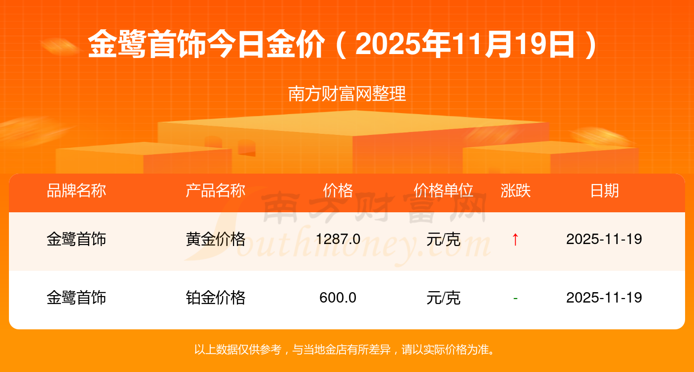 現(xiàn)在金鷺首飾黃金價(jià)格是多少錢1克_2025年金鷺首飾今日金價(jià)是多少錢一克,最新金鷺首飾查詢,2025年11月19日金鷺首飾鉑金價(jià)格現(xiàn)在每克多少錢?最新金鷺首飾鉑金價(jià)格報(bào)價(jià)公布,一起來(lái)看看吧!