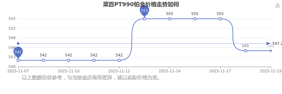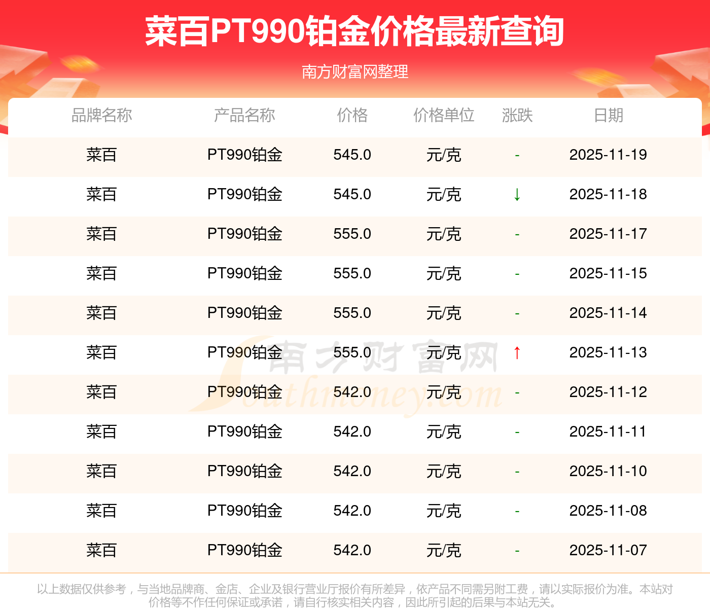 545.0元/克是菜百在今日給出的 PT990鉑金最新價格。