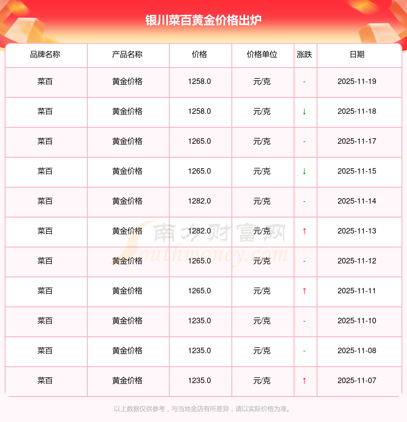 以上數(shù)據(jù)僅供參考,與當(dāng)?shù)仄放粕、金店、企業(yè)及銀行營(yíng)業(yè)廳報(bào)價(jià)有所差異,依產(chǎn)品不同需另附工費(fèi),請(qǐng)以實(shí)際報(bào)價(jià)為準(zhǔn)。本站對(duì)價(jià)格等不作任何保證或承諾,請(qǐng)自行核實(shí)相關(guān)內(nèi)容,因此所引起的后果與本站無(wú)關(guān)。
