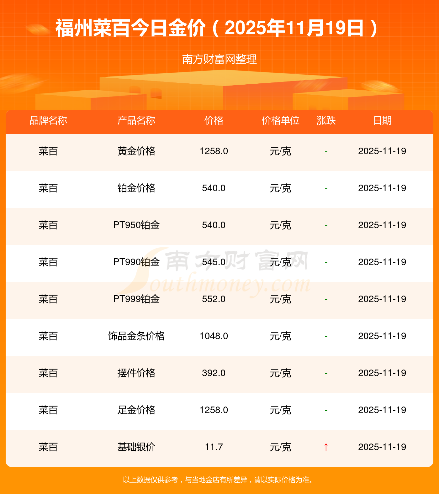 因各門店黃金價格報價有差異,具體以當?shù)亟鸬挈S金報價為準,此黃金價格數(shù)據(jù)僅供參考,不做任何購買黃金首飾交易根據(jù)。