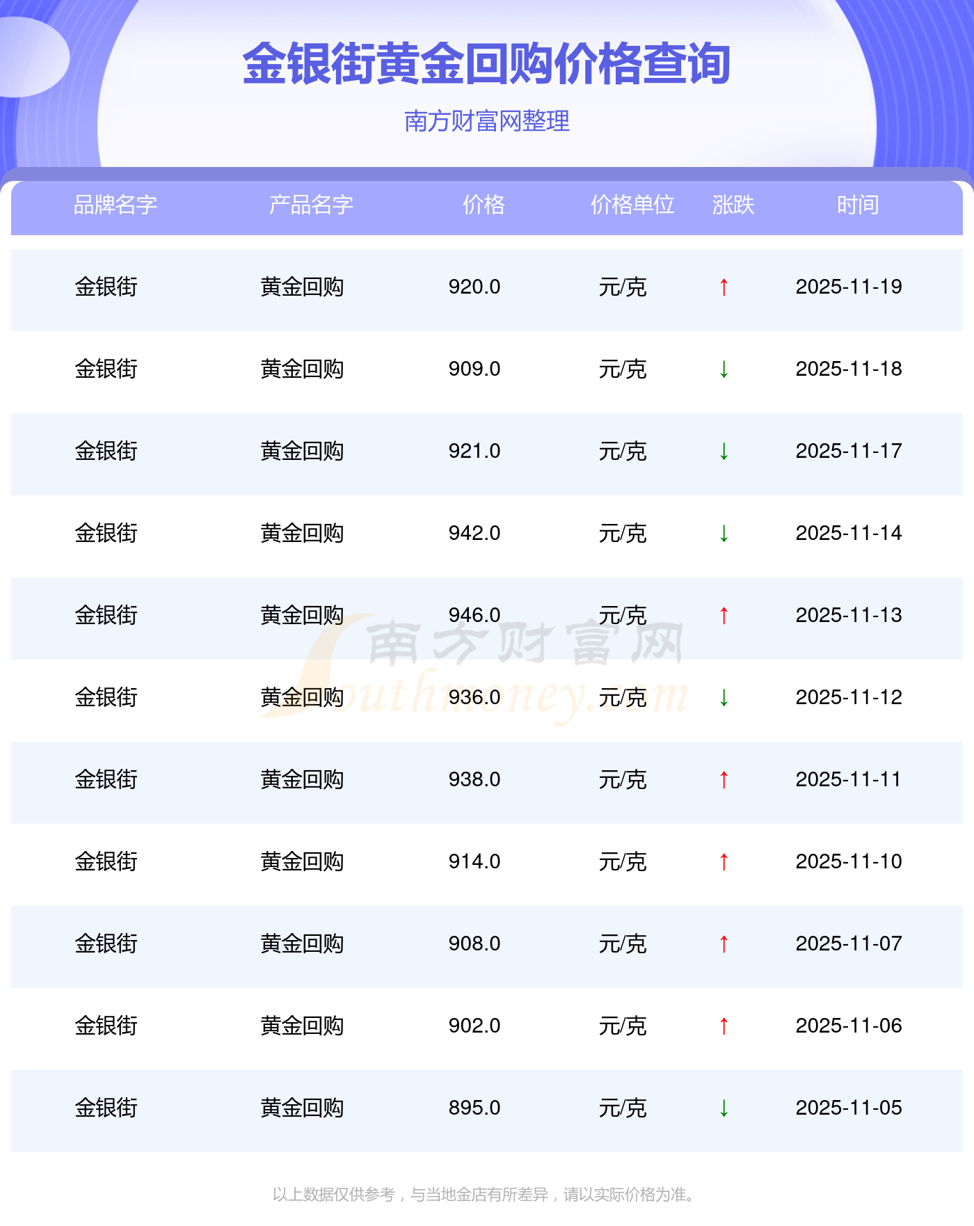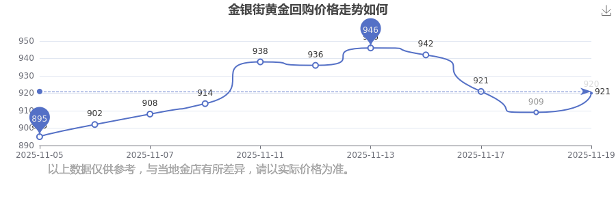 今日(2025年11月19日)金銀街黃金回購的價(jià)格為920.0元/克。