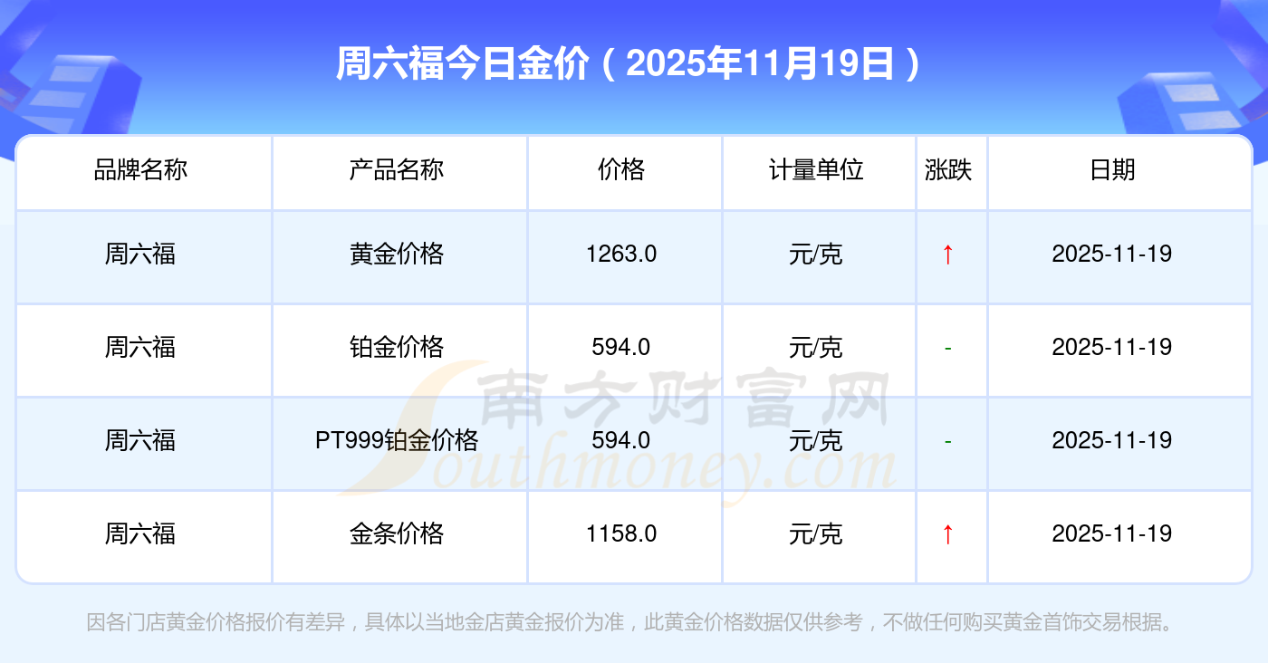 周六福現(xiàn)在金價多少錢一克?周六福今天金條價格多少一克?最新周六福查詢,2025年11月19日周六福金條價格現(xiàn)在每克多少錢?最新周六福金條價格報價公布,一起來看看吧!