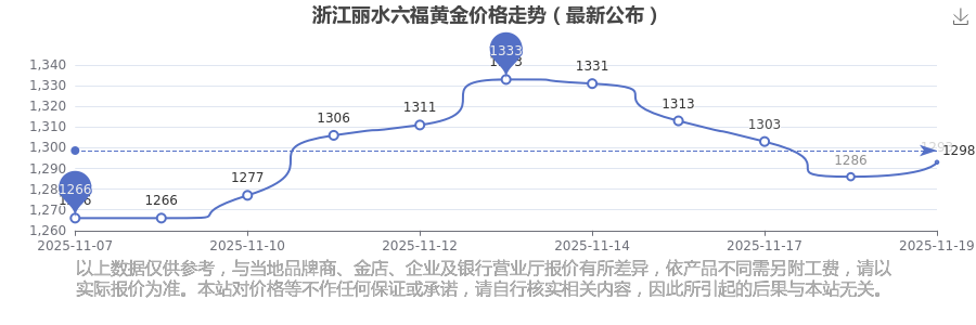 2025年11月19日,今日浙江麗水六福黃金價格:1293.0元/克。