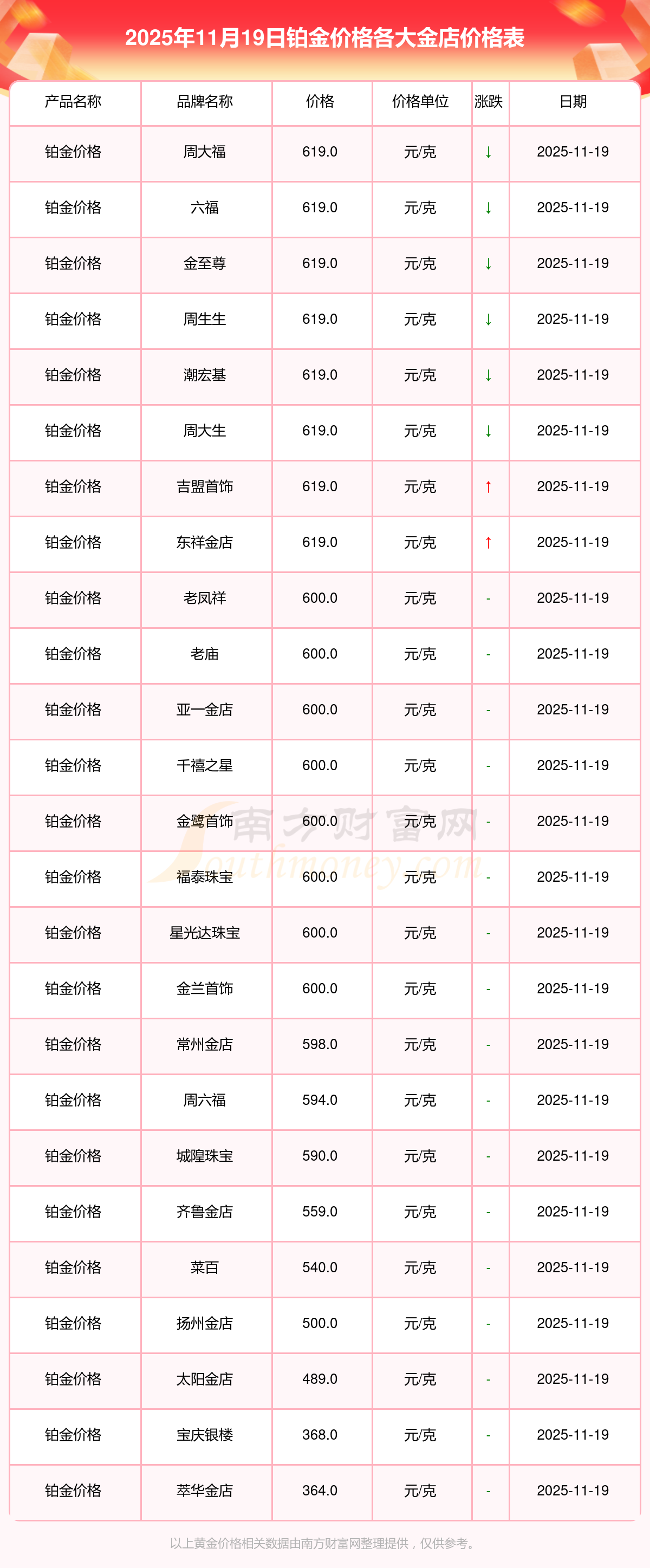 2025年11月19日各大金店鉑金價格最新價格:周大福1295.0元/克,周大福619.0元/克,周大福1295.0元/克,周大福45120.0,周大福17690.0,周大福40700.0,周大福1133.0元/克,老鳳祥1291.0元/克,老鳳祥600.0元/克,老鳳祥1291.0元/克,周六福1263.0元/克。