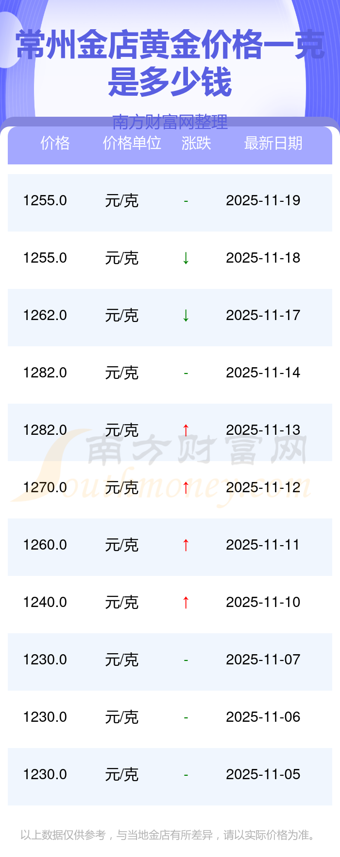 常州金店 黃金價(jià)格在今日更新至1255.0元/克。