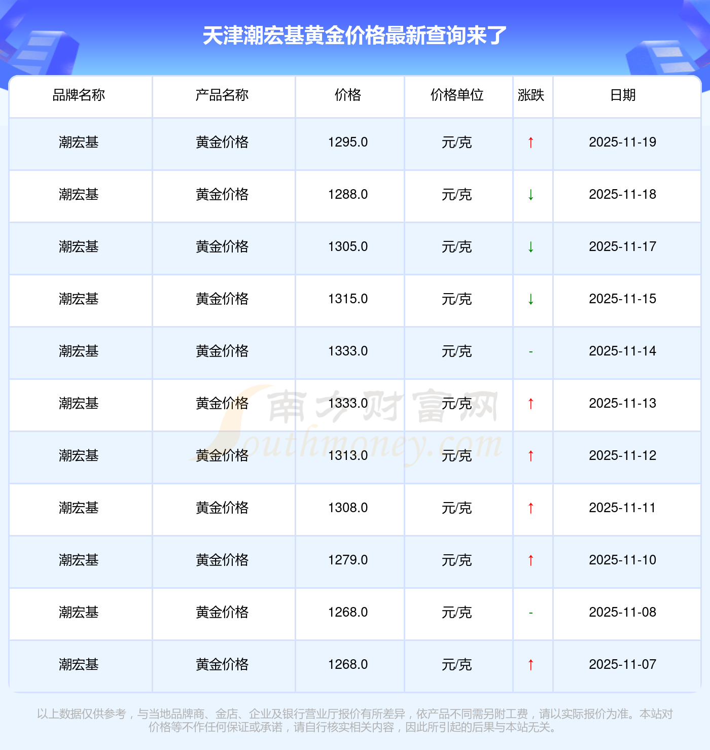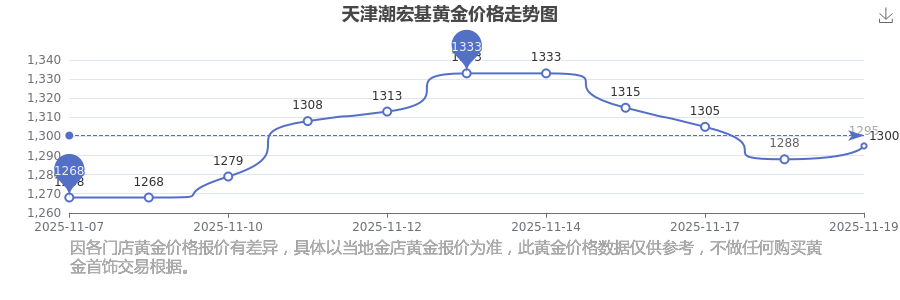 2025年11月19日天津潮宏基黃金價(jià)格為1295.0元/克。