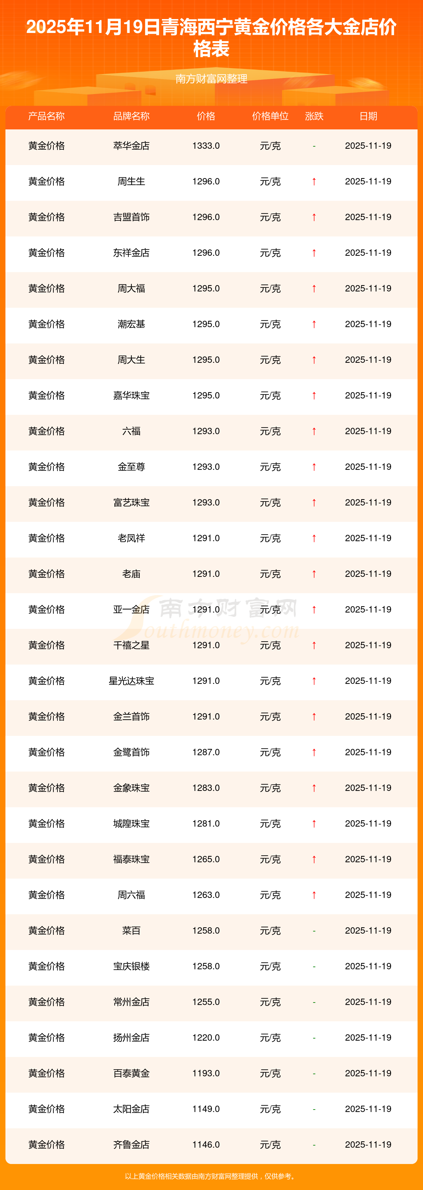 2025年11月19日青海西寧周大福、周大福、周大福、周大福、周大福、周大福、周大福、老鳳祥、老鳳祥、老鳳祥、周六福等各大金店品牌黃金價(jià)格最新價(jià)格行情來了,如下:周大福黃金價(jià)格1295.0元/克,周大福鉑金價(jià)格619.0元/克,周大福飾品金價(jià)(內(nèi)地)1295.0元/克,周大福黃金飾品(香港)45120.0,周大福鉑金價(jià)格(香港)17690.0,周大福金條價(jià)格(香港)40700.0,周大福金條金價(jià)(內(nèi)地)1133.0元/克,老鳳祥黃金價(jià)格1291.0元/克,老鳳祥鉑金價(jià)格600.0元/克,老鳳祥足金價(jià)格1291.0元/克,周六福黃金價(jià)格1263.0元/克。