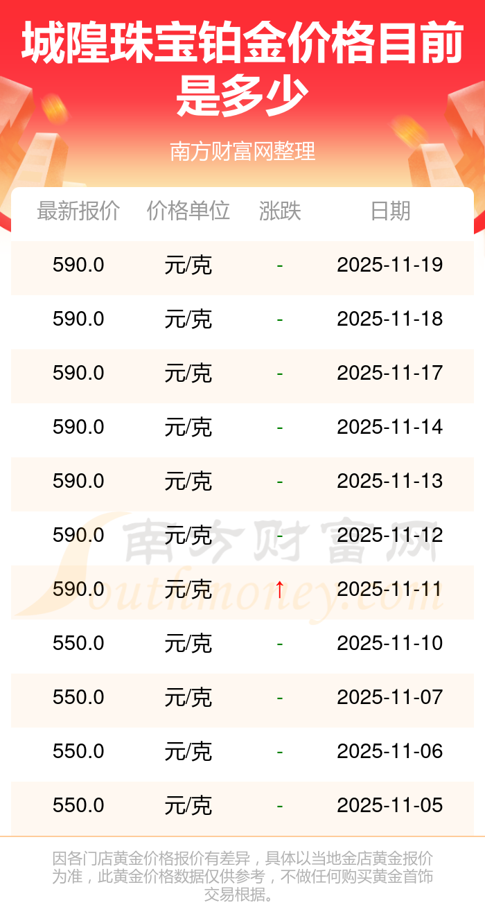 590.0元/克的價格,是城隍珠寶今日 鉑金價格的最新行情。