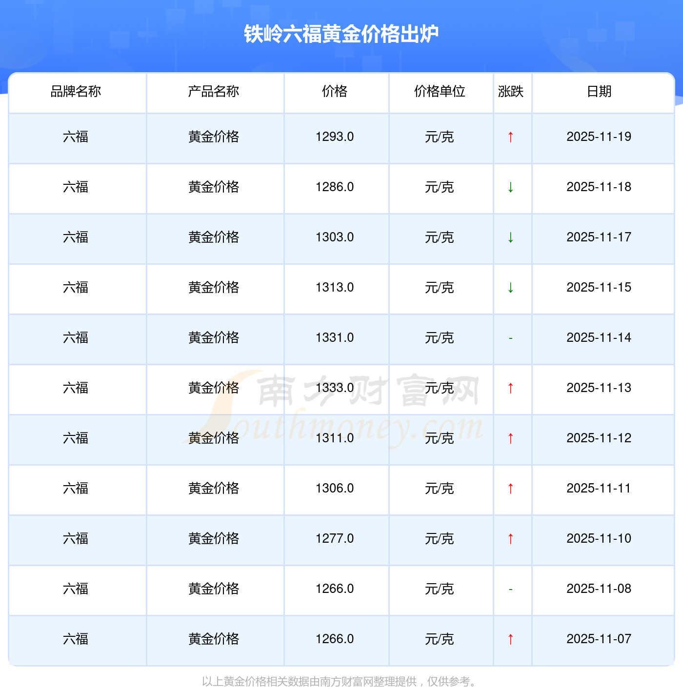 (2025年11月19日)今日鐵嶺六福黃金價格是1293.0元/克。