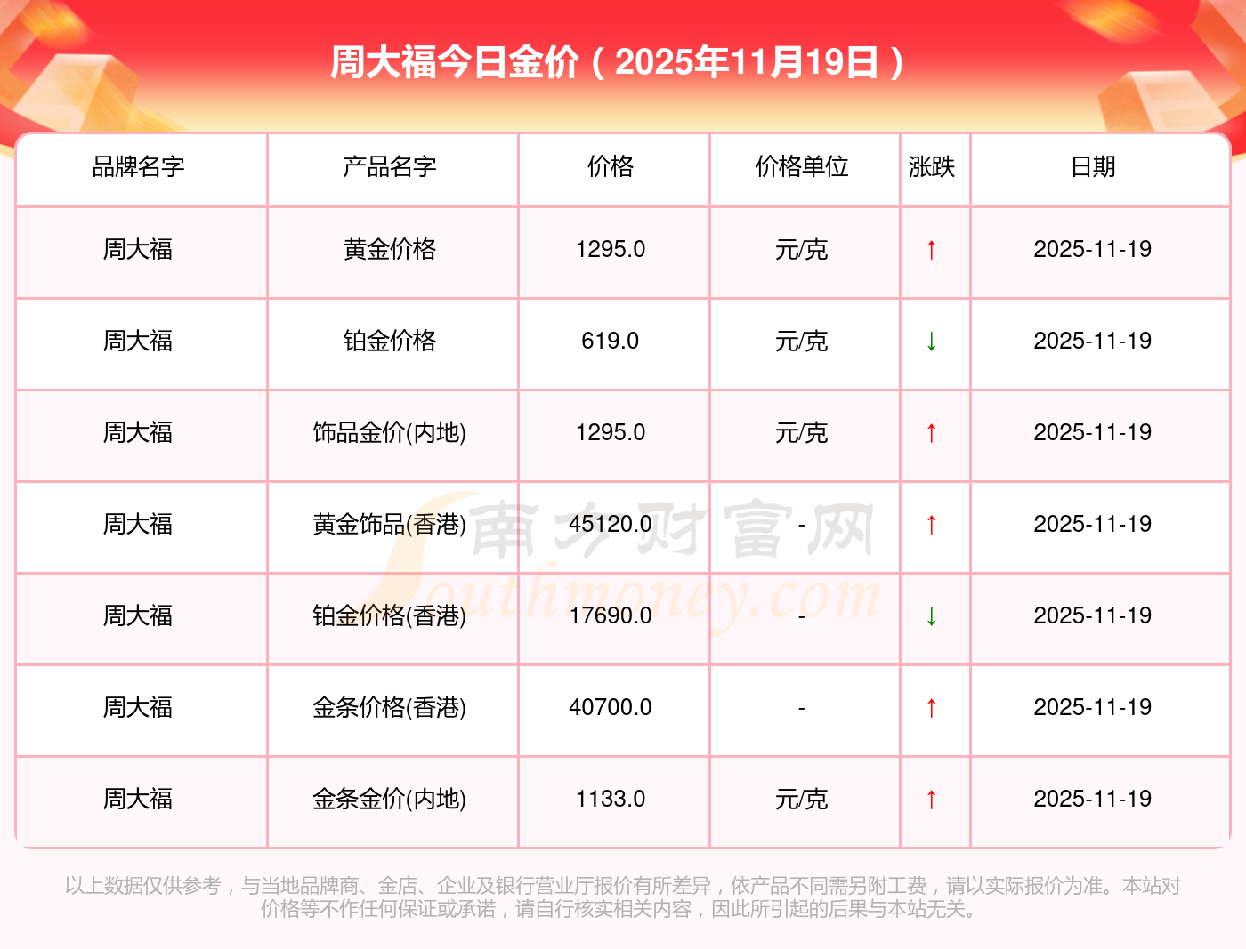 周大福金條價(jià)格今日最新價(jià)2025實(shí)時(shí)查詢_周大,F(xiàn)在金價(jià)格是多少錢一克,2025年11月19日周大福飾品金價(jià)(內(nèi)地)現(xiàn)在每克多少錢?最新周大福飾品金價(jià)(內(nèi)地)報(bào)價(jià)公布,一起來看看吧!