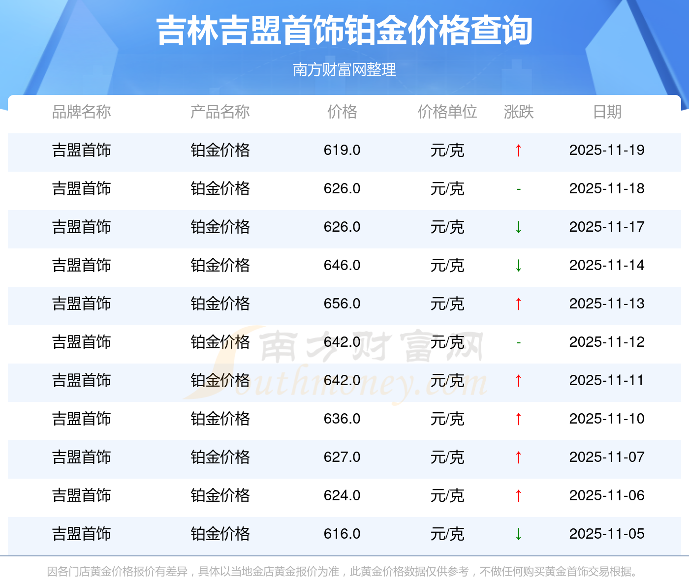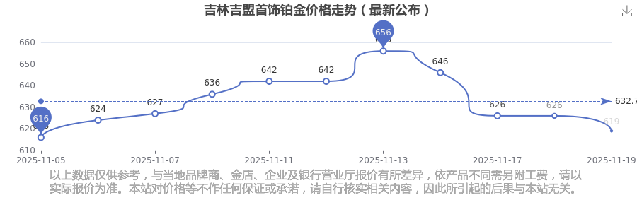 今日吉林吉盟首飾鉑金價(jià)格為619.0元/克。