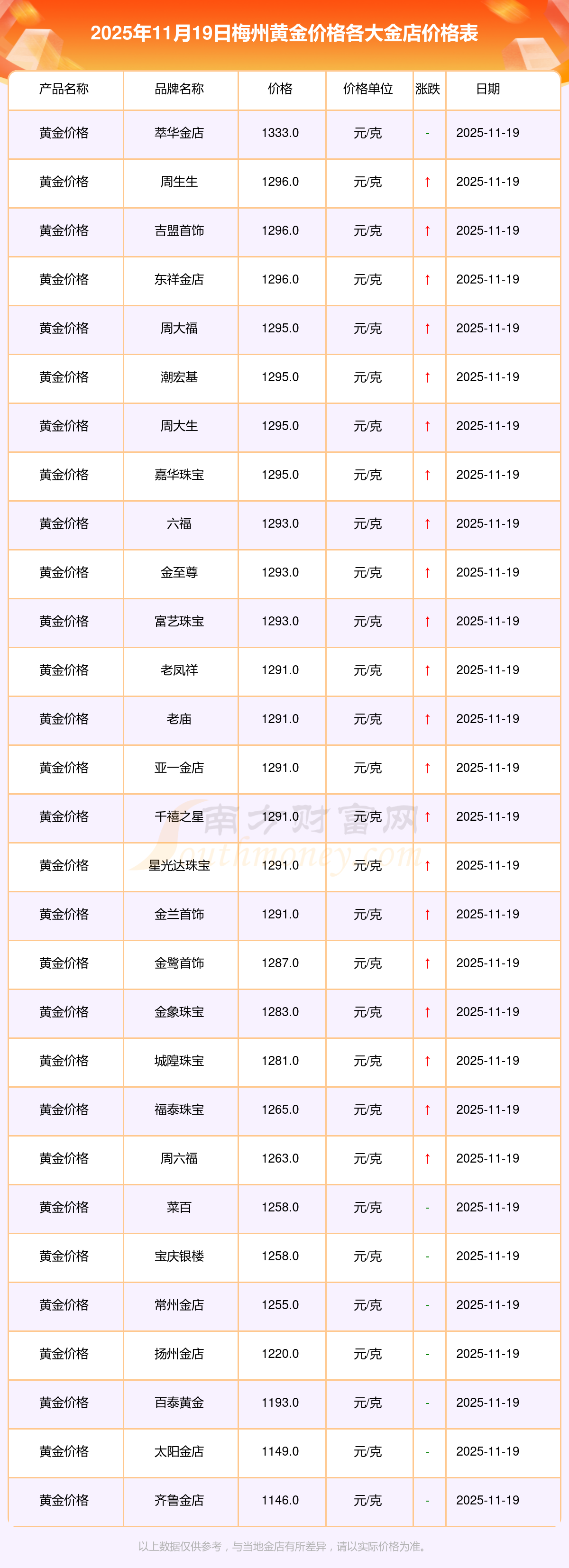 2025年11月19日梅州各金店黃金價格是多少錢一克?各金店黃金價格表