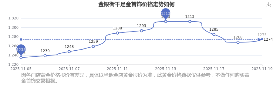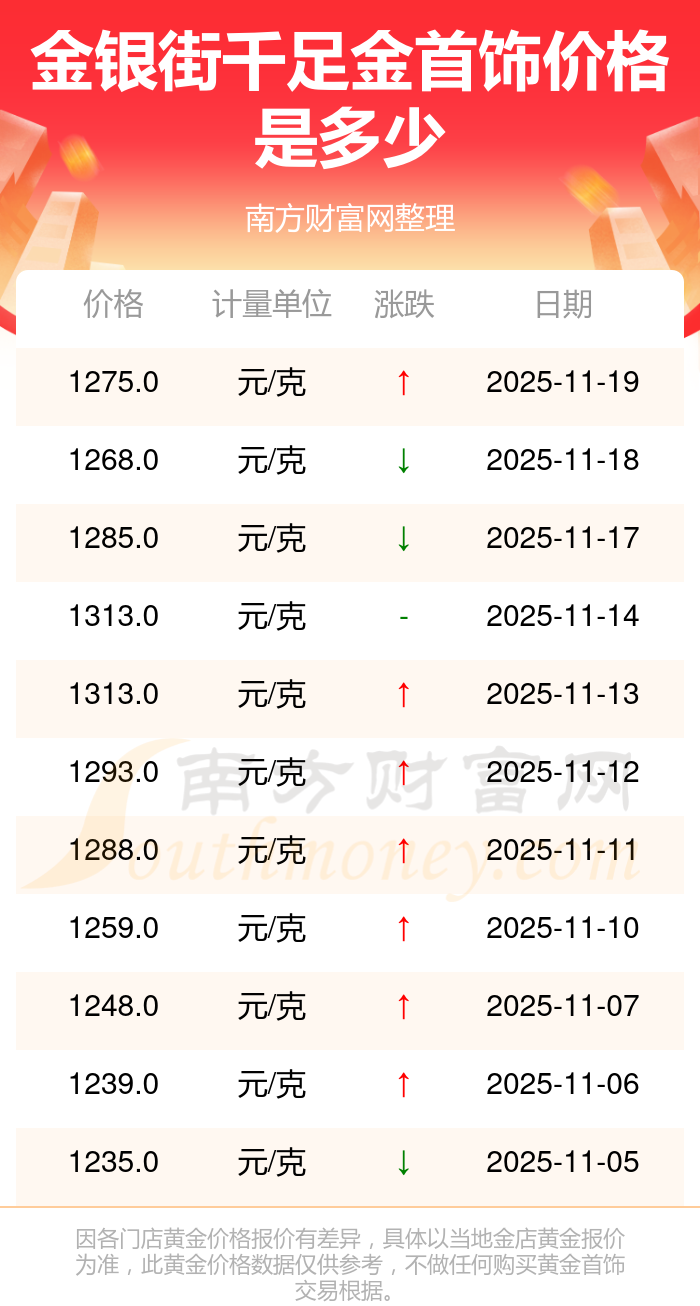 今日金銀街 千足金首飾最新的克重售價為1275.0元/克。