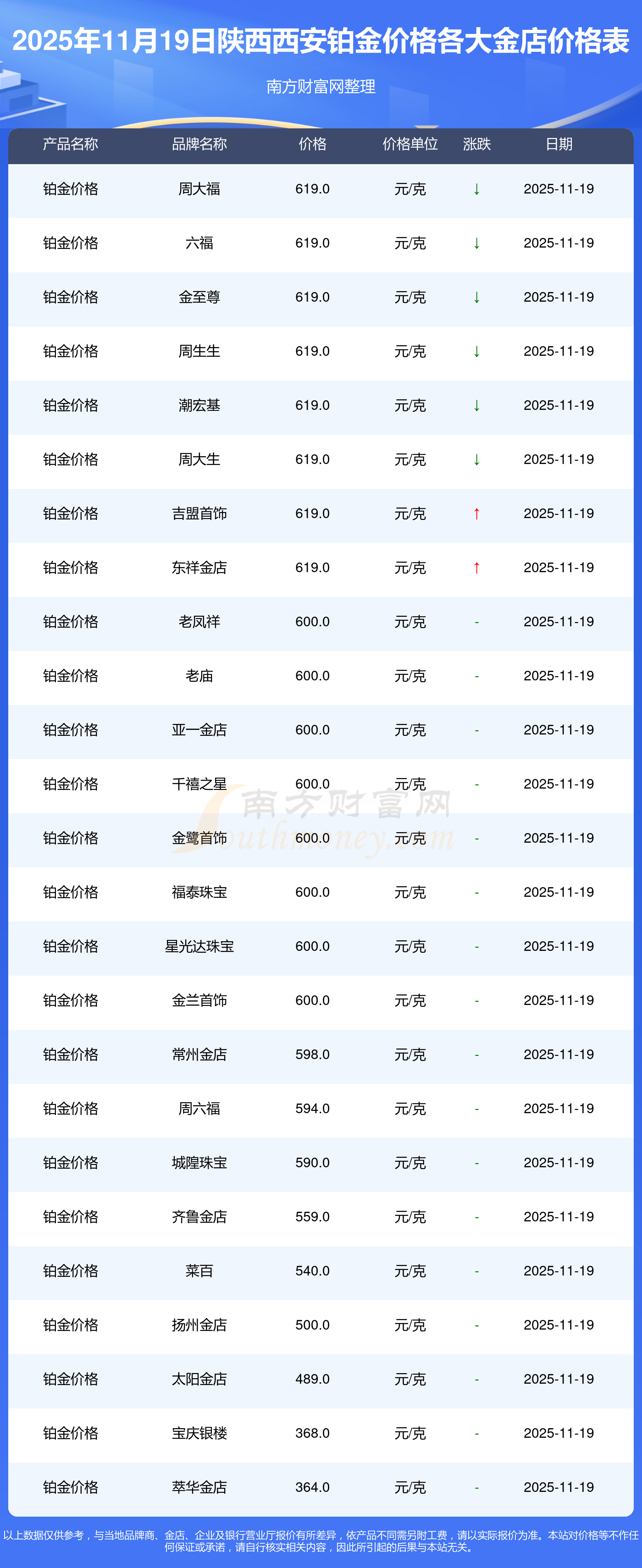 今天是2025年11月19日,陜西西安周大福、周大福、周大福、周大福、周大福、周大福、周大福、老鳳祥、老鳳祥、老鳳祥、周六福等各大金店品牌鉑金價(jià)格最新價(jià)格行情是這樣的:周大福1295.0元/克、周大福619.0元/克、周大福1295.0元/克、周大福45120.0、周大福17690.0、周大福40700.0、周大福1133.0元/克、老鳳祥1291.0元/克、老鳳祥600.0元/克、老鳳祥1291.0元/克、周六福1263.0元/克。