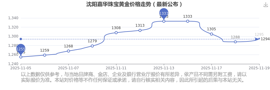 沈陽嘉華珠寶黃金價格在 2025年11月19日為 1295.0元/克。