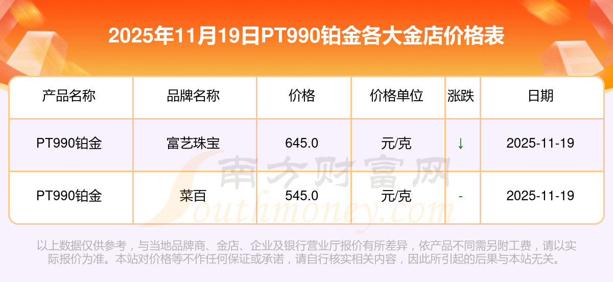 今天是2025年11月19日,周大福、周大福、周大福、周大福、周大福、周大福、周大福、老鳳祥、老鳳祥、老鳳祥、周六福等各大金店品牌PT990鉑金最新價格如下:周大福1295.0元/克、周大福619.0元/克、周大福1295.0元/克、周大福45120.0、周大福17690.0、周大福40700.0、周大福1133.0元/克、老鳳祥1291.0元/克、老鳳祥600.0元/克、老鳳祥1291.0元/克、周六福1263.0元/克。