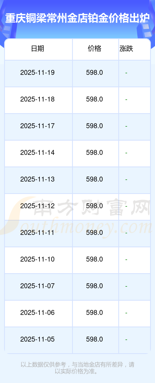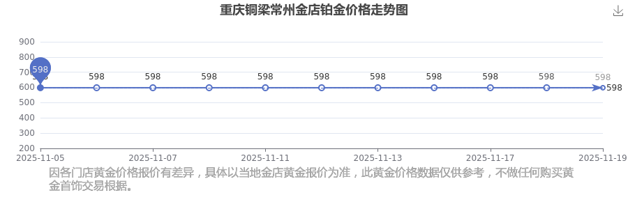 今日重慶銅梁常州金店鉑金價(jià)格最新為:598.0元/克。