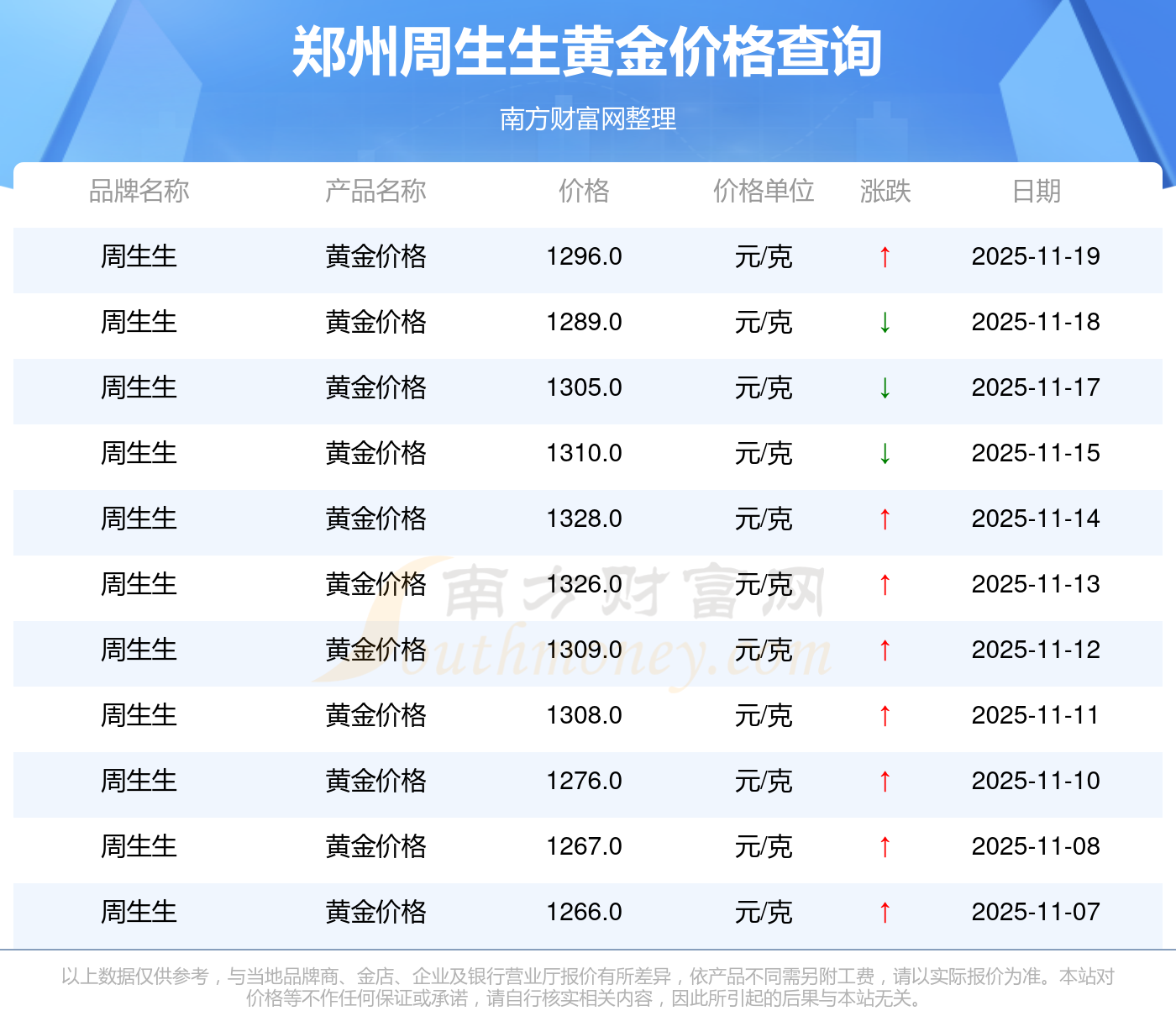 今日鄭州周生生黃金價格公布想問問,今日黃金每克的定價為多少2025年11月19日當(dāng)天,鄭州周生生黃金價格的單價是 1296.0元/克。