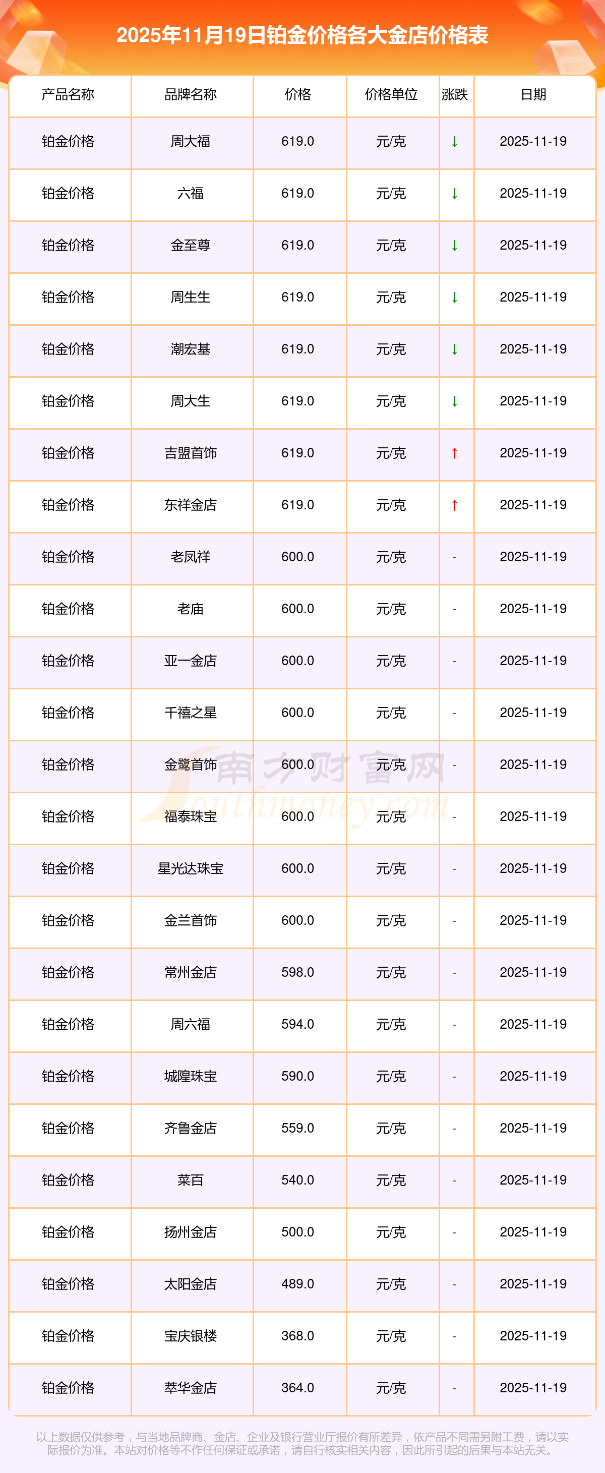 今天是2025年11月19日,周大福、周大福、周大福、周大福、周大福、周大福、周大福、老鳳祥、老鳳祥、老鳳祥、周六福等各大金店品牌鉑金價(jià)格最新價(jià)格如下:周大福1295.0元/克、周大福619.0元/克、周大福1295.0元/克、周大福45120.0、周大福17690.0、周大福40700.0、周大福1133.0元/克、老鳳祥1291.0元/克、老鳳祥600.0元/克、老鳳祥1291.0元/克、周六福1263.0元/克。
