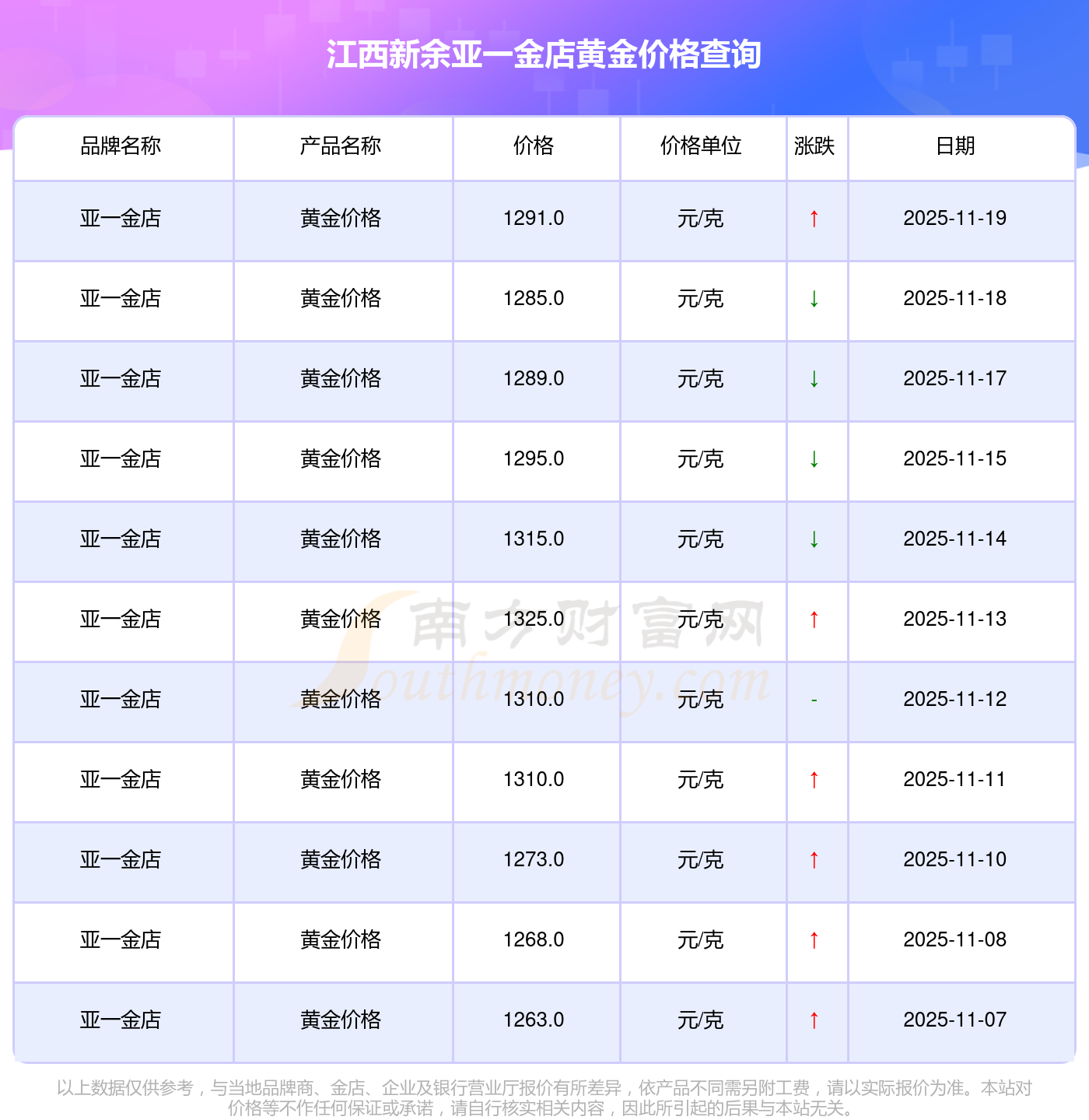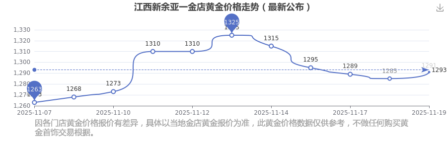 江西新余亞一金店在 2025年11月19日,黃金價(jià)格的售賣價(jià)格是 1291.0元/克。