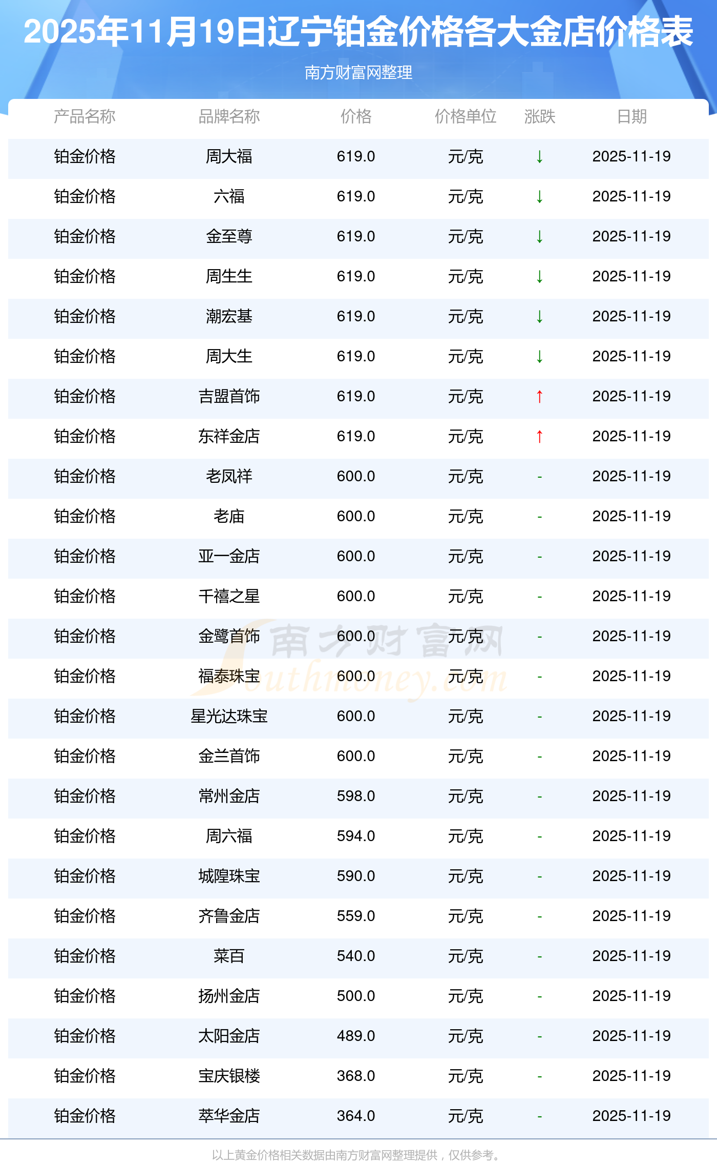 2025年11月19日遼寧周大福、周大福、周大福、周大福、周大福、周大福、周大福、老鳳祥、老鳳祥、老鳳祥、周六福等各大金店品牌鉑金價格最新價格行情來了,如下:周大福黃金價格1295.0元/克,周大福鉑金價格619.0元/克,周大福飾品金價(內(nèi)地)1295.0元/克,周大福黃金飾品(香港)45120.0,周大福鉑金價格(香港)17690.0,周大福金條價格(香港)40700.0,周大福金條金價(內(nèi)地)1133.0元/克,老鳳祥黃金價格1291.0元/克,老鳳祥鉑金價格600.0元/克,老鳳祥足金價格1291.0元/克,周六福黃金價格1263.0元/克。