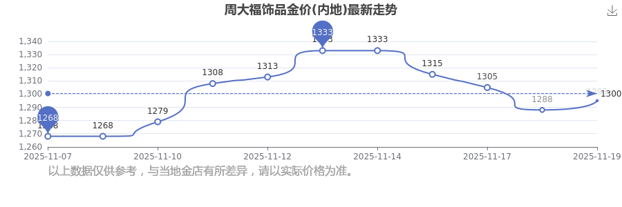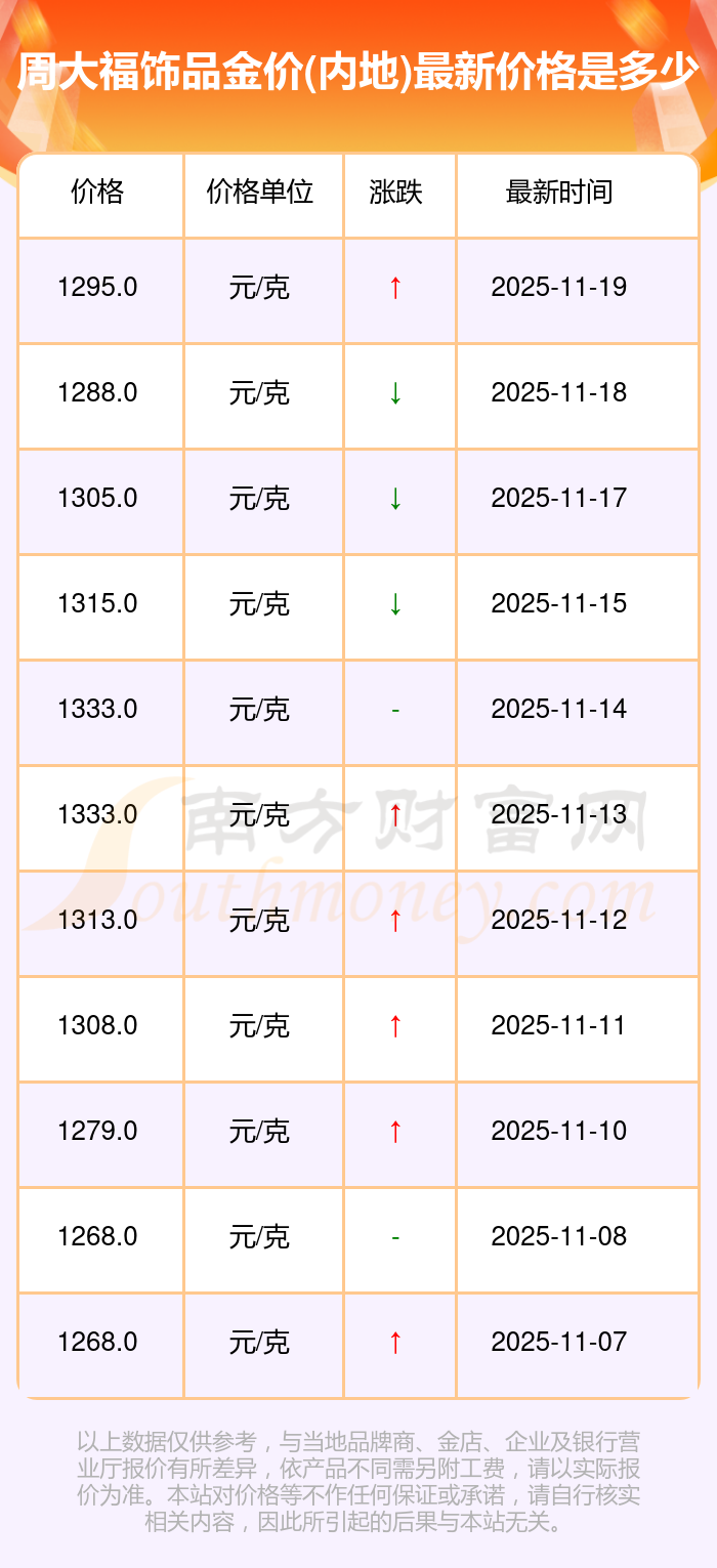 今日(2025年11月19日),周大福飾品金價(內(nèi)地)最新價格為1295.0元/克。