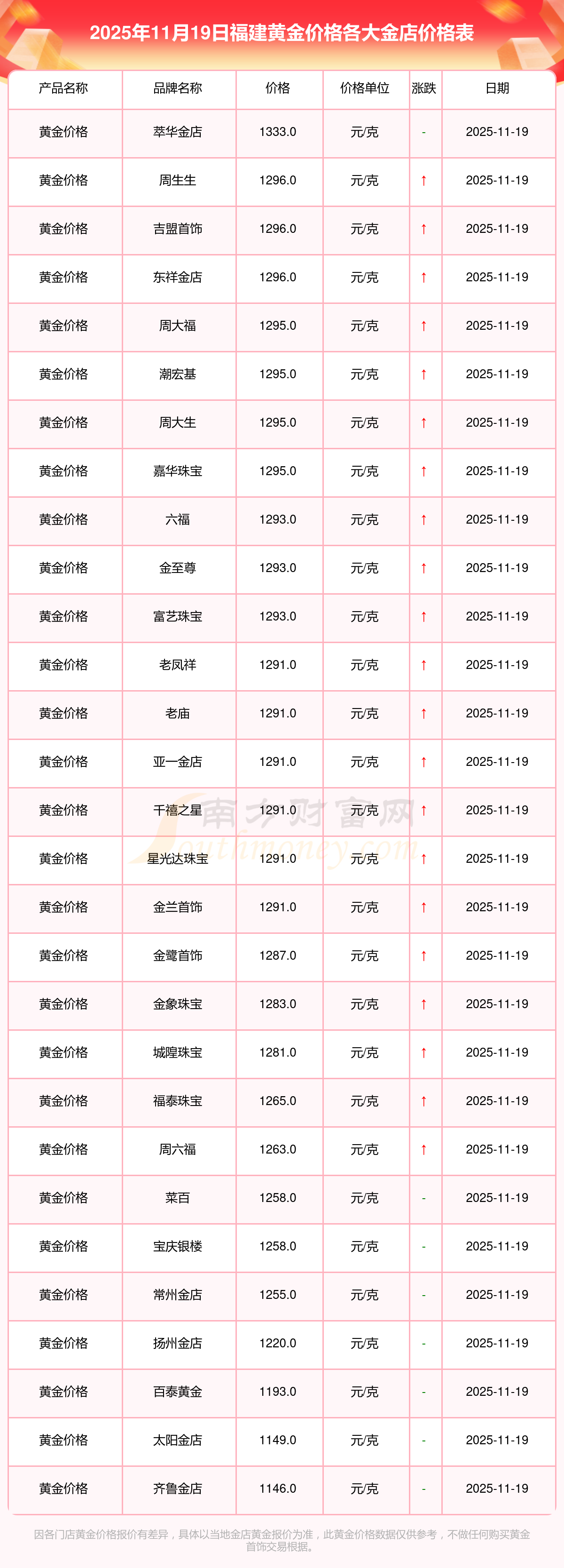 2025年11月19日福建周大福、周大福、周大福、周大福、周大福、周大福、周大福、老鳳祥、老鳳祥、老鳳祥、周六福等各大金店品牌黃金價(jià)格最新價(jià)格如下:周大福黃金價(jià)格1295.0元/克,周大福鉑金價(jià)格619.0元/克,周大福飾品金價(jià)(內(nèi)地)1295.0元/克,周大福黃金飾品(香港)45120.0,周大福鉑金價(jià)格(香港)17690.0,周大福金條價(jià)格(香港)40700.0,周大福金條金價(jià)(內(nèi)地)1133.0元/克,老鳳祥黃金價(jià)格1291.0元/克,老鳳祥鉑金價(jià)格600.0元/克,老鳳祥足金價(jià)格1291.0元/克,周六福黃金價(jià)格1263.0元/克。