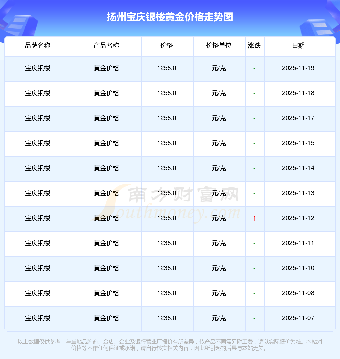 2025年11月19日,周大福、周大福、周大福、周大福、周大福、周大福、周大福、老鳳祥、老鳳祥、老鳳祥、周六福等各大金店品牌黃金價格今日價格如下:周大福1295.0元/克、周大福619.0元/克、周大福1295.0元/克、周大福45120.0、周大福17690.0、周大福40700.0、周大福1133.0元/克、老鳳祥1291.0元/克、老鳳祥600.0元/克、老鳳祥1291.0元/克、周六福1263.0元/克。