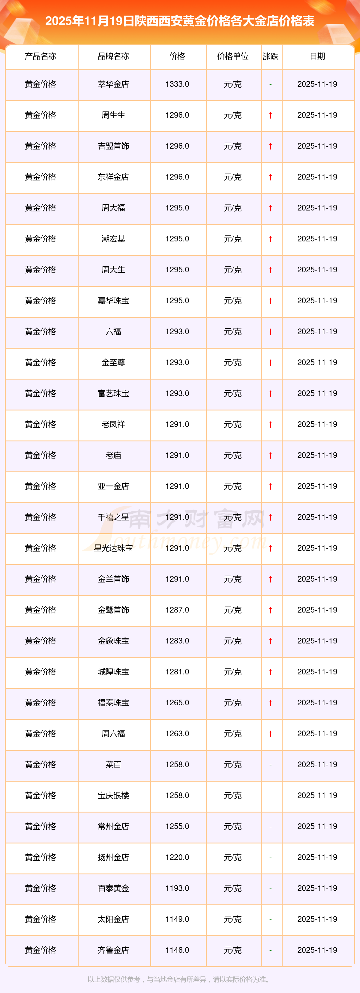 2025年11月19日,陜西西安周大福、周大福、周大福、周大福、周大福、周大福、周大福、老鳳祥、老鳳祥、老鳳祥、周六福等各大金店品牌黃金價(jià)格今日價(jià)格行情最新來了:周大福1295.0元/克、周大福619.0元/克、周大福1295.0元/克、周大福45120.0、周大福17690.0、周大福40700.0、周大福1133.0元/克、老鳳祥1291.0元/克、老鳳祥600.0元/克、老鳳祥1291.0元/克、周六福1263.0元/克。
