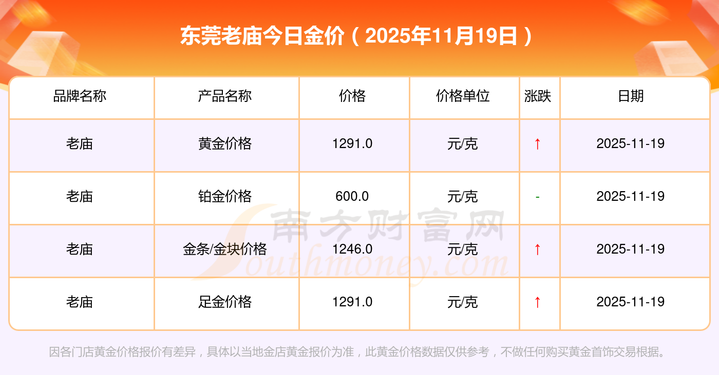 2025年11月19日東莞老廟最新價(jià)格:黃金價(jià)格1295.0元/克,鉑金價(jià)格619.0元/克,飾品金價(jià)(內(nèi)地)1295.0元/克,黃金飾品(香港)45120.0,鉑金價(jià)格(香港)17690.0,金條價(jià)格(香港)40700.0,金條金價(jià)(內(nèi)地)1133.0元/克,黃金價(jià)格1291.0元/克,鉑金價(jià)格600.0元/克,足金價(jià)格1291.0元/克,黃金價(jià)格1263.0元/克。