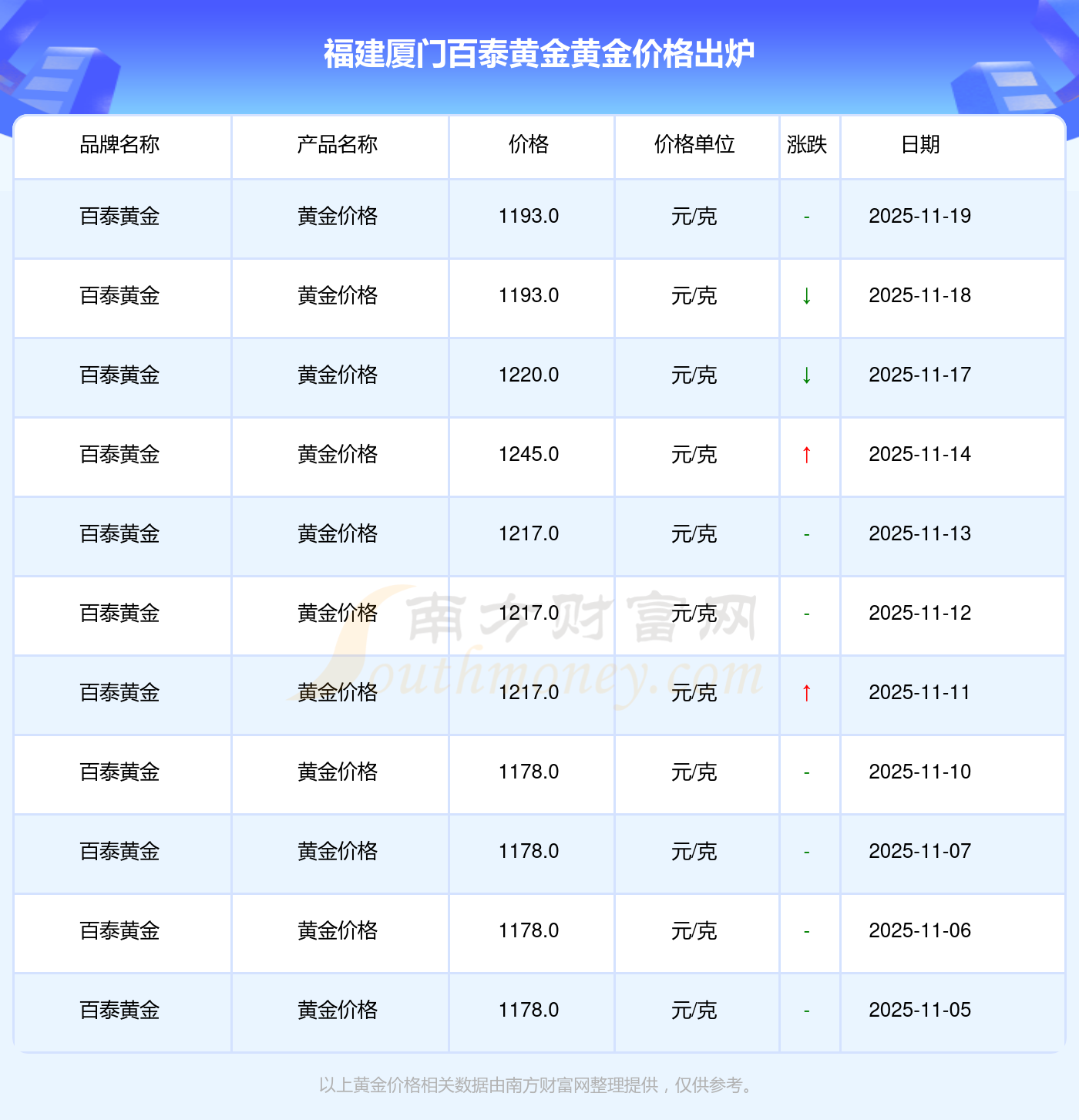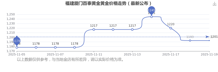 1193.0元/克的黃金價格,是福建廈門百泰黃金在 2025年11月19日給出的。