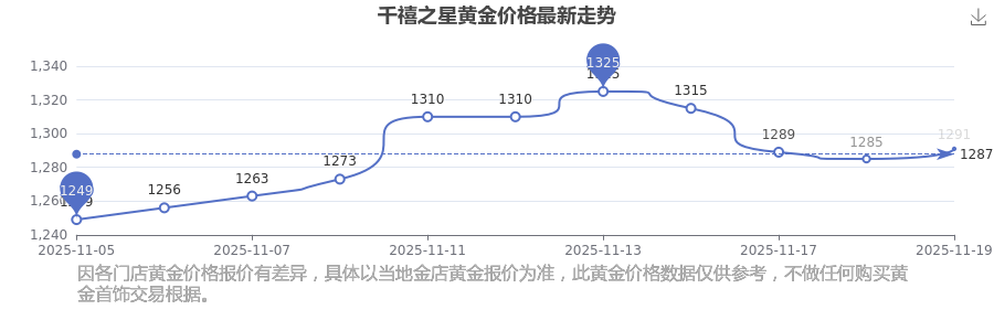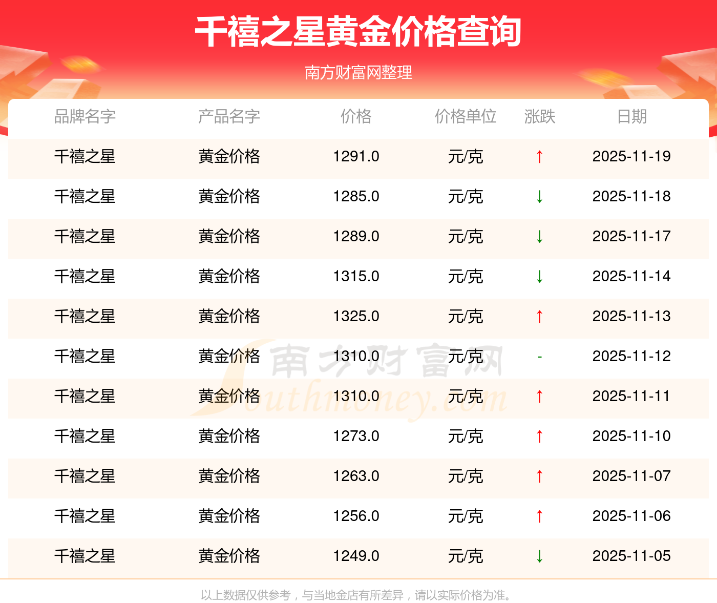 今日(2025年11月19日)千禧之星黃金價格:1291.0元/克。