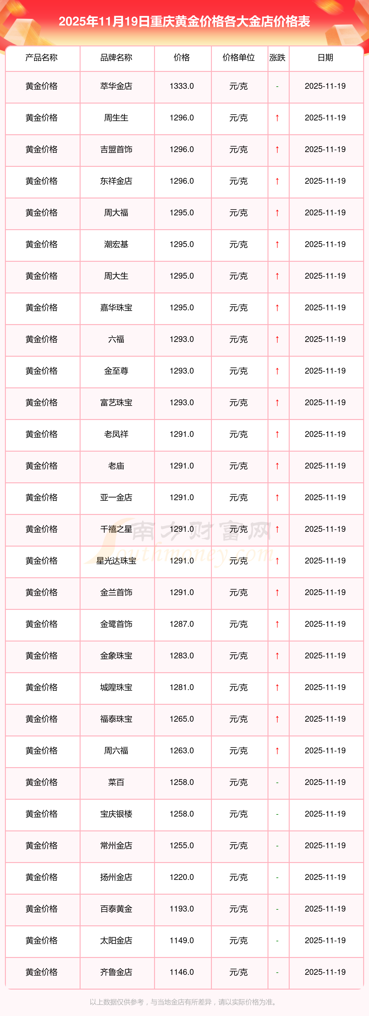 今天是2025年11月19日,重慶周大福、周大福、周大福、周大福、周大福、周大福、周大福、老鳳祥、老鳳祥、老鳳祥、周六福等各大金店品牌黃金價格最新價格如下:周大福1295.0元/克、周大福619.0元/克、周大福1295.0元/克、周大福45120.0、周大福17690.0、周大福40700.0、周大福1133.0元/克、老鳳祥1291.0元/克、老鳳祥600.0元/克、老鳳祥1291.0元/克、周六福1263.0元/克。