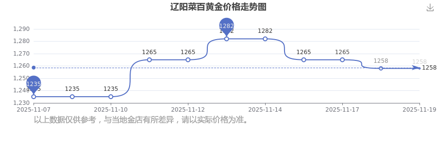 遼陽(yáng)菜百在 2025年11月19日的黃金價(jià)格零售價(jià)格為 1258.0元/克。