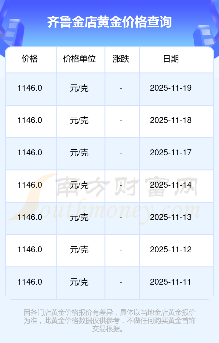 今日黃金價(jià)格是怎樣的?當(dāng)下黃金一克要賣多少錢?通常情況下黃金每一克的價(jià)格大概是多少呢?2025年11月20日齊魯金店黃金價(jià)格查詢:1146.0元/克。