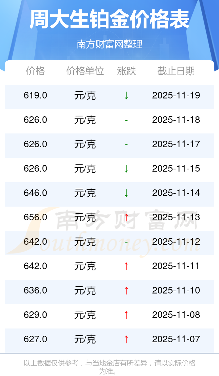 最新數(shù)據(jù)表明,周大生今日 鉑金價(jià)格為619.0元/克。