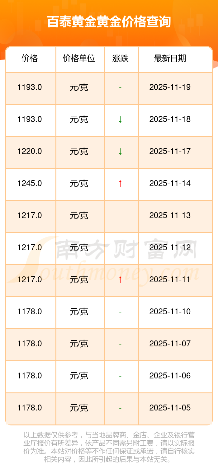 今日百泰黃金 黃金價格最新的克重售價為1193.0元/克。