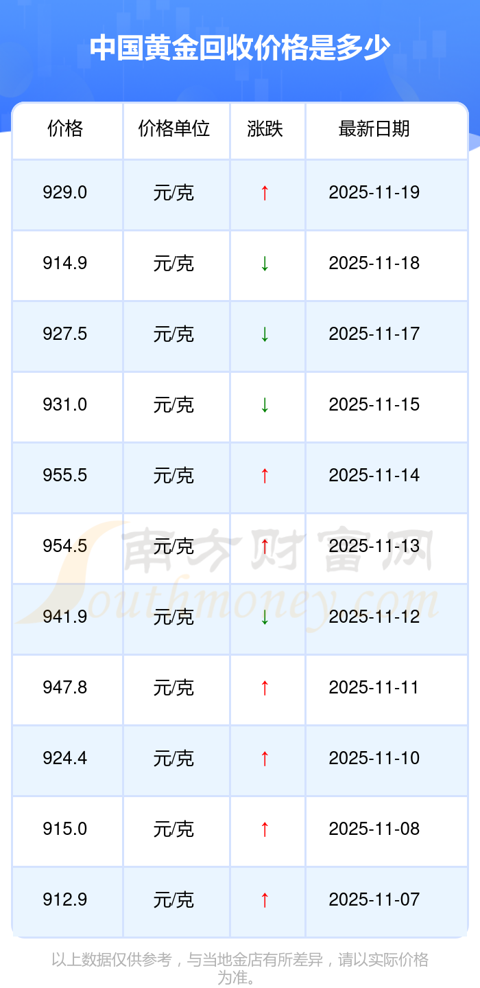 今日(2025年11月20日),中國黃金回收價最新價格是929.0元/克。