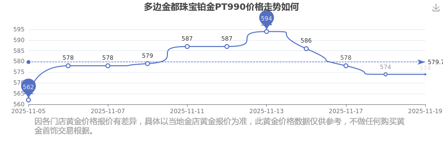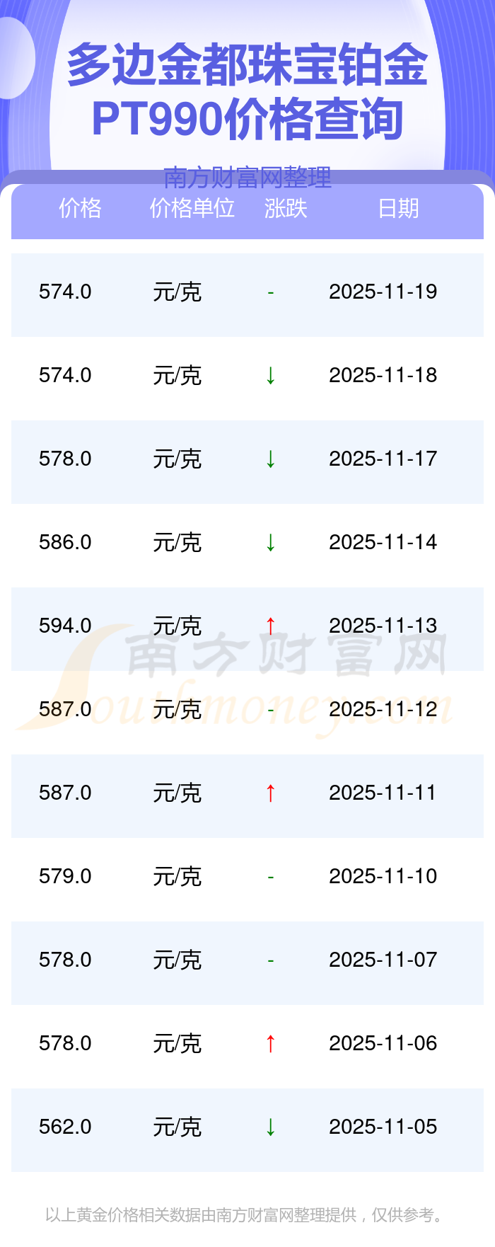 今日多邊金都珠寶鉑金PT990價(jià)格是574.0元/克。