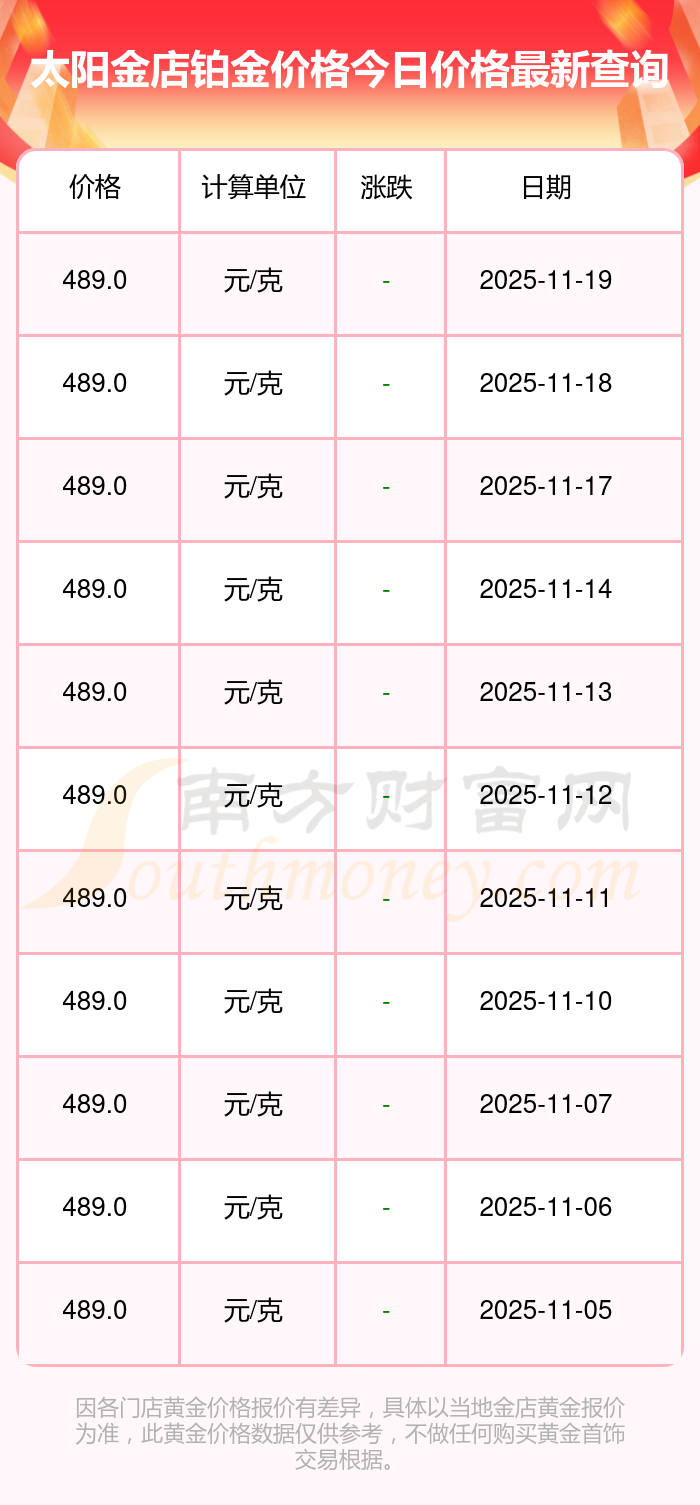 最新數(shù)據(jù)表明,太陽金店今日 鉑金價(jià)格為489.0元/克。