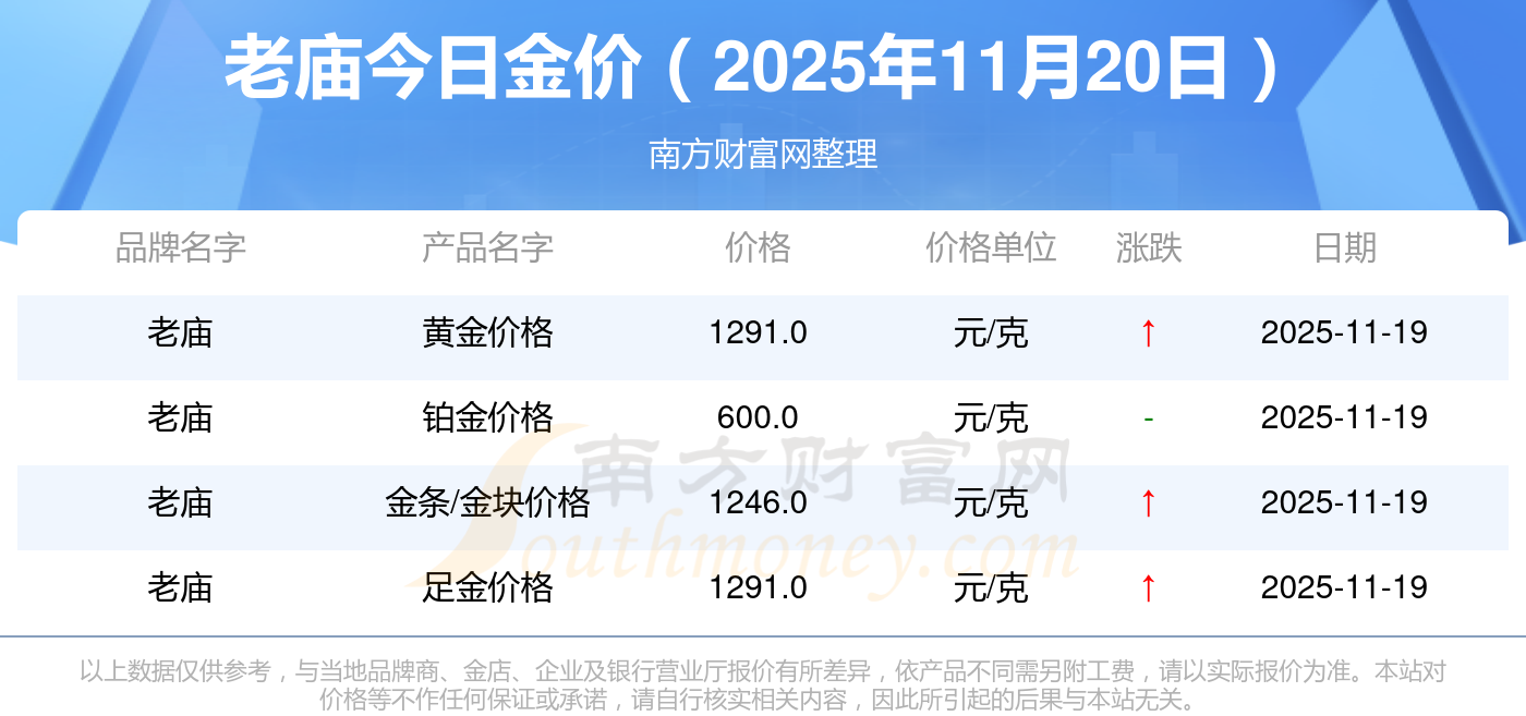 2025年11月20日老廟今日價(jià)格:黃金價(jià)格1295.0元/克,鉑金價(jià)格619.0元/克,飾品金價(jià)(內(nèi)地)1295.0元/克,黃金飾品(香港)45120.0,鉑金價(jià)格(香港)17690.0,金條價(jià)格(香港)40700.0,金條金價(jià)(內(nèi)地)1133.0元/克,黃金價(jià)格1291.0元/克,鉑金價(jià)格600.0元/克,足金價(jià)格1291.0元/克,黃金價(jià)格1263.0元/克。