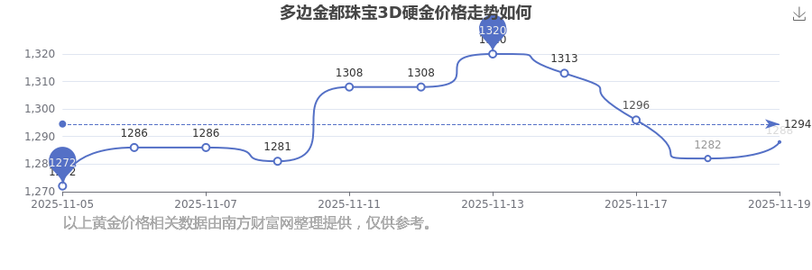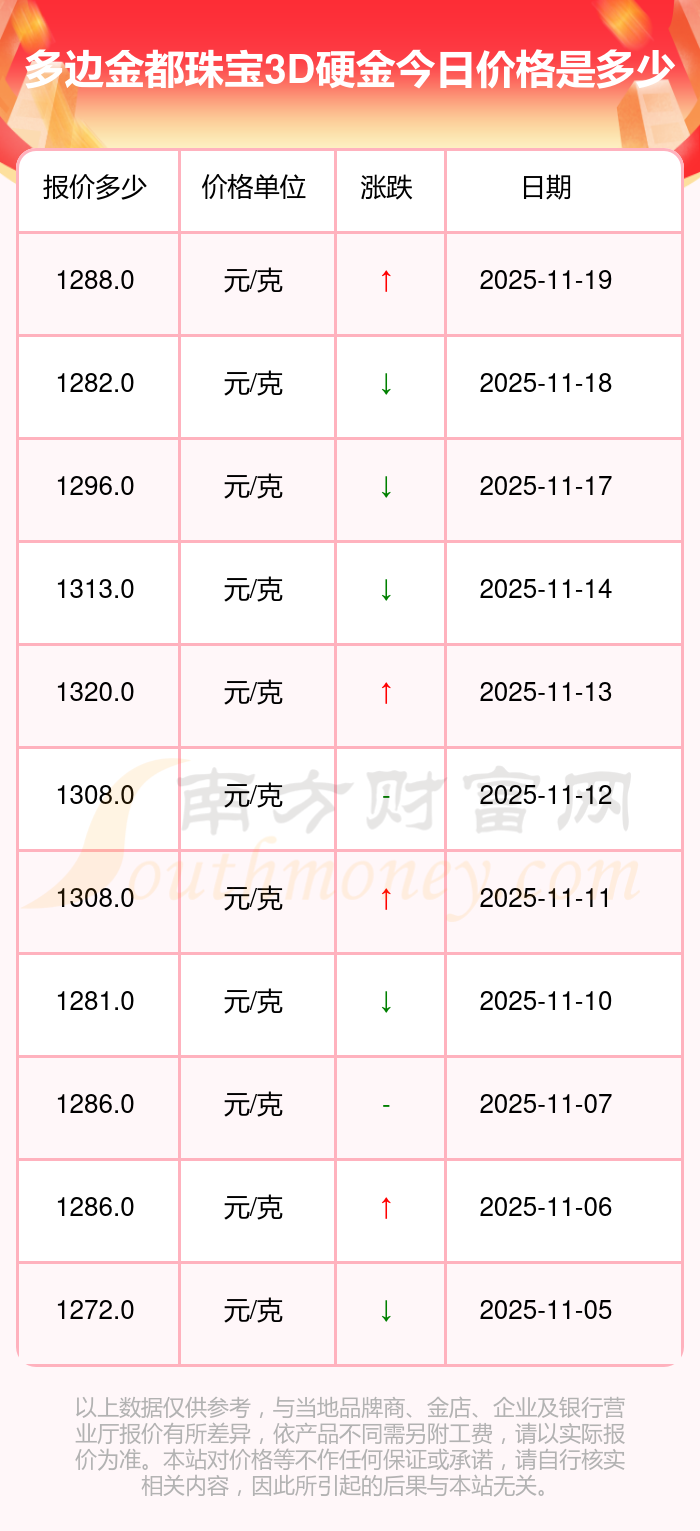 2025年11月20日多邊金都珠寶3D硬金價格為1288.0元/克。