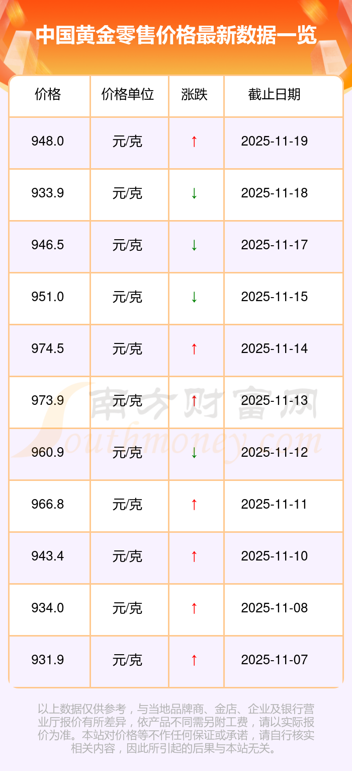 今日中國黃金 零售價最新的克重售價為948.0元/克。
