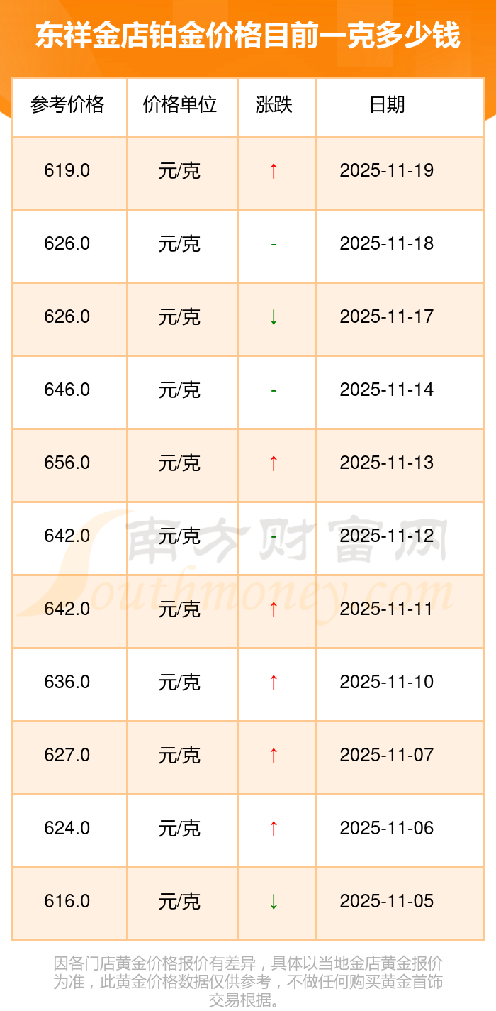 2025年11月20日東祥金店鉑金價格為619.0元/克。